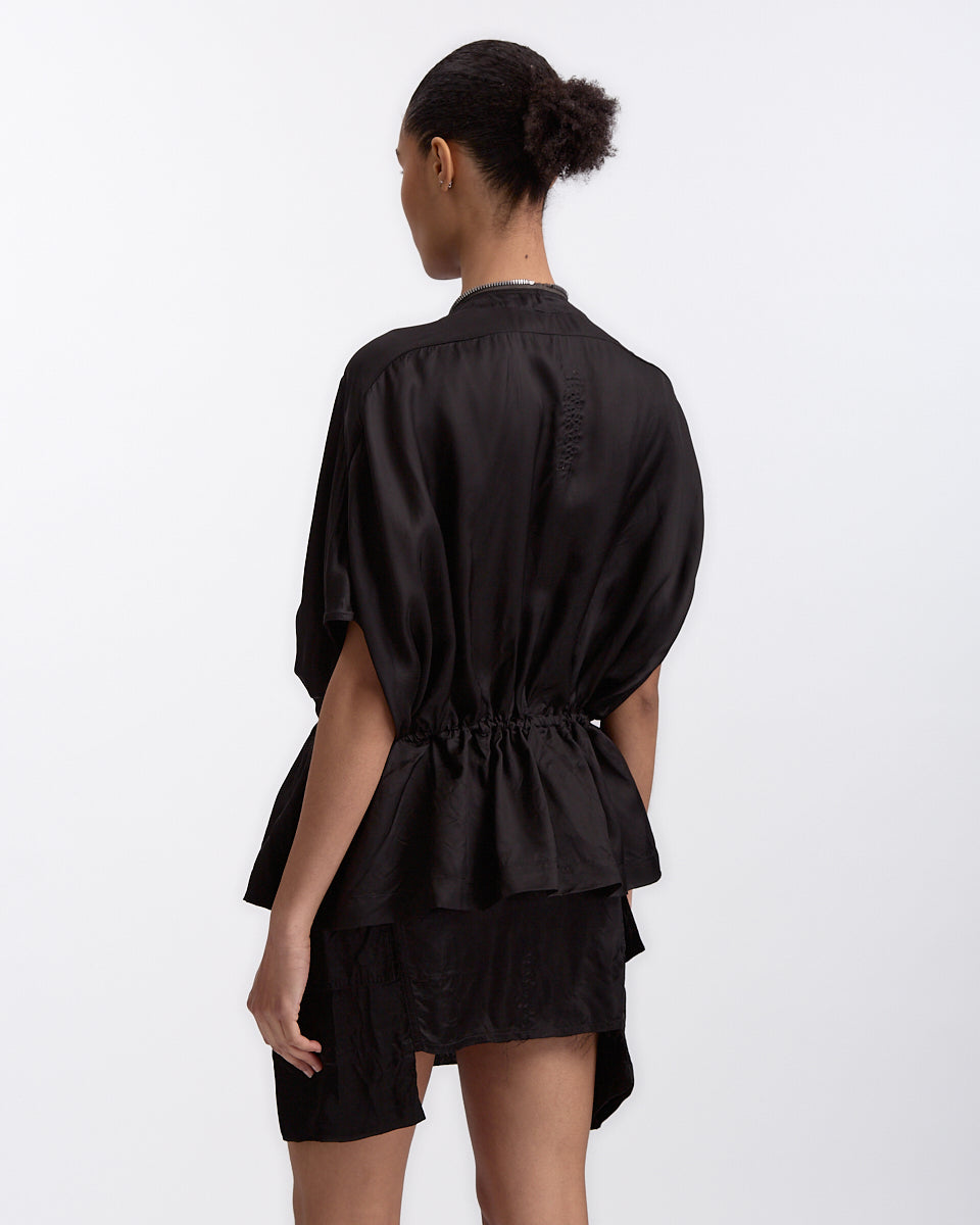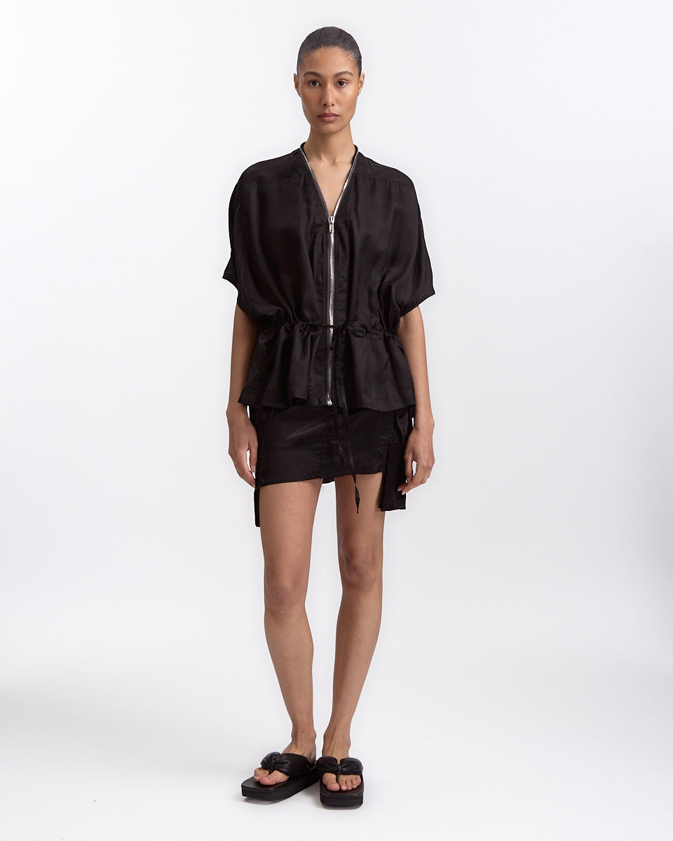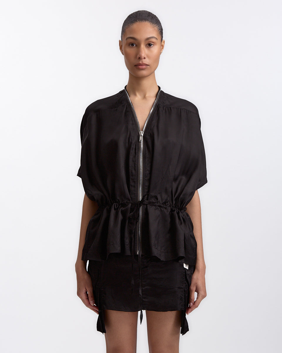 Rick Owens Sail Jacket in black features a gilet jacket in a crinkled cupro fabrication. Details include wrap around front zip closure, back yoke and adjustable drawstring waist fastening.
