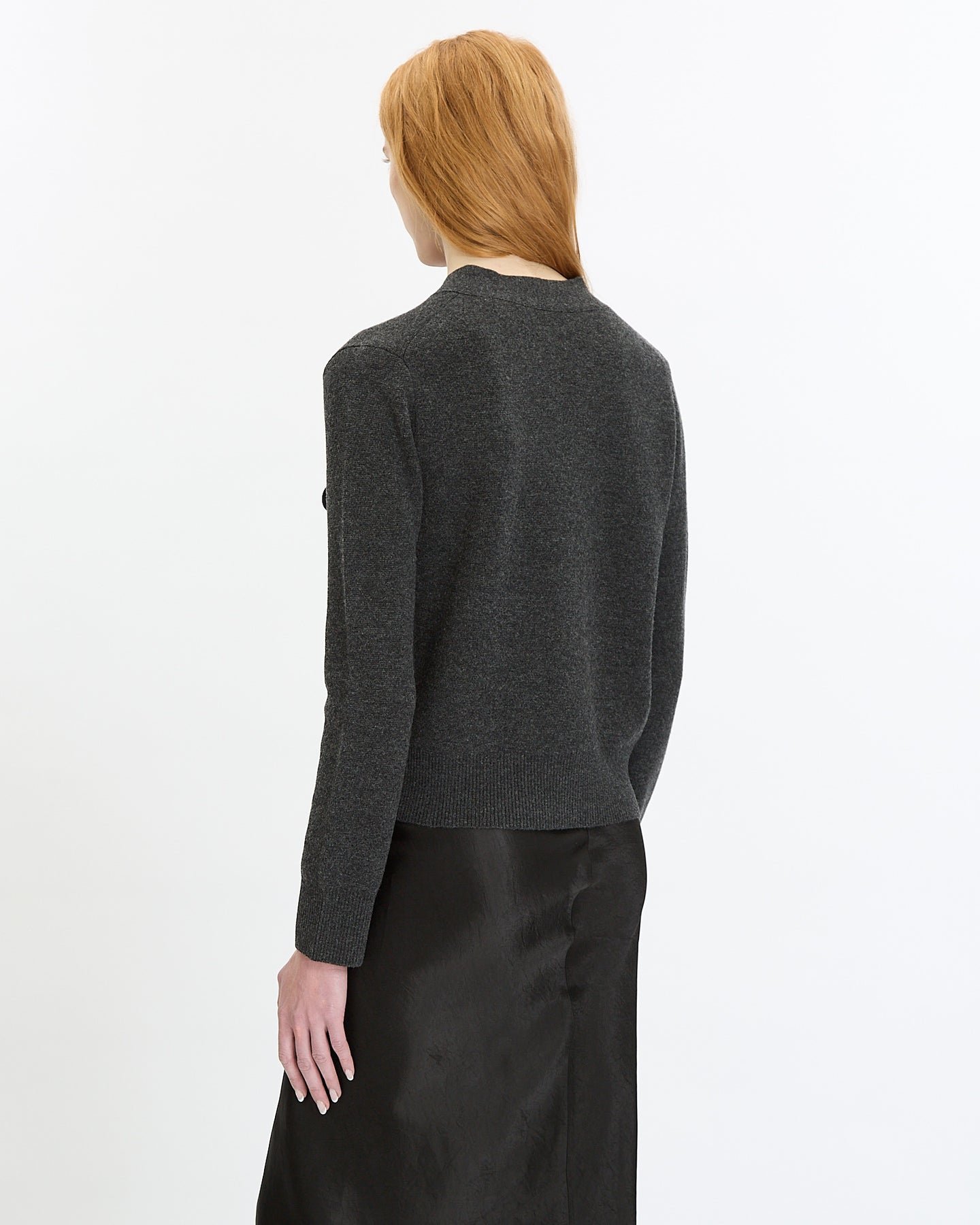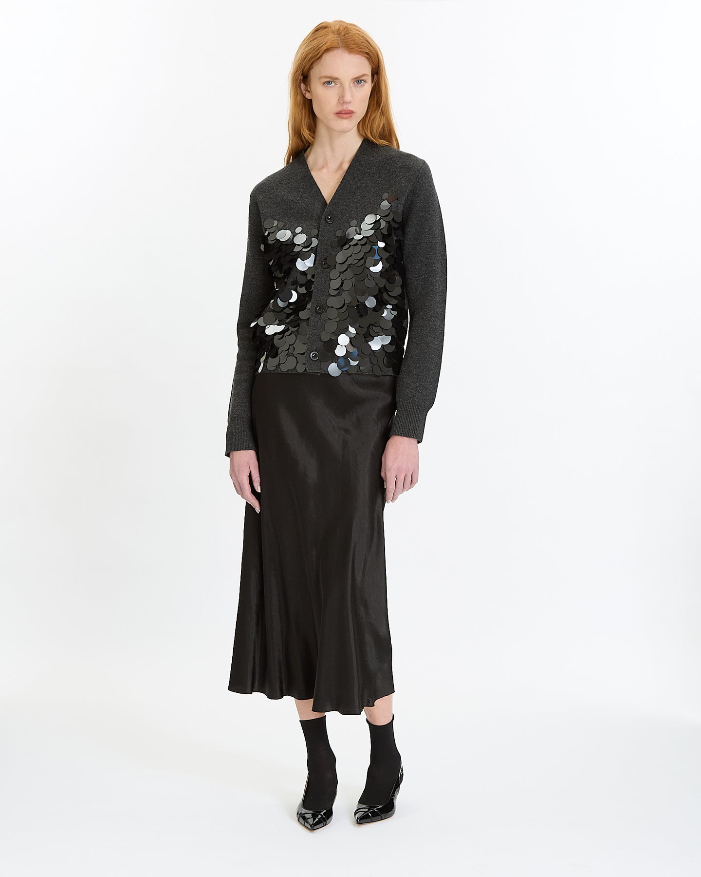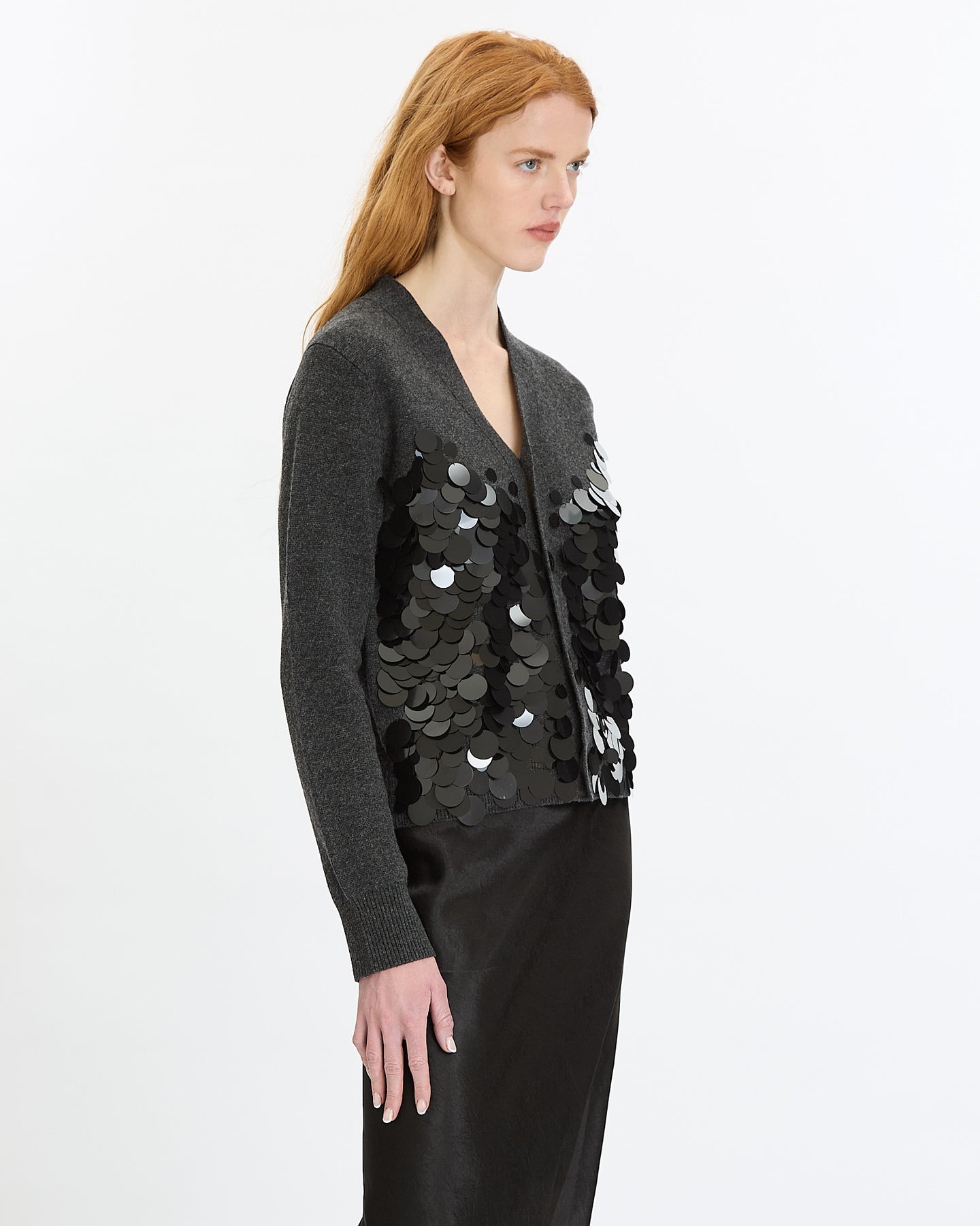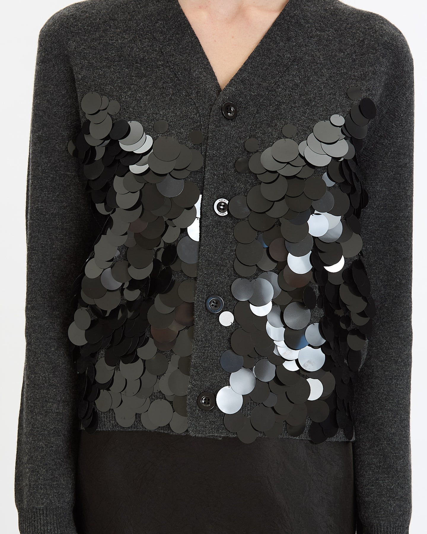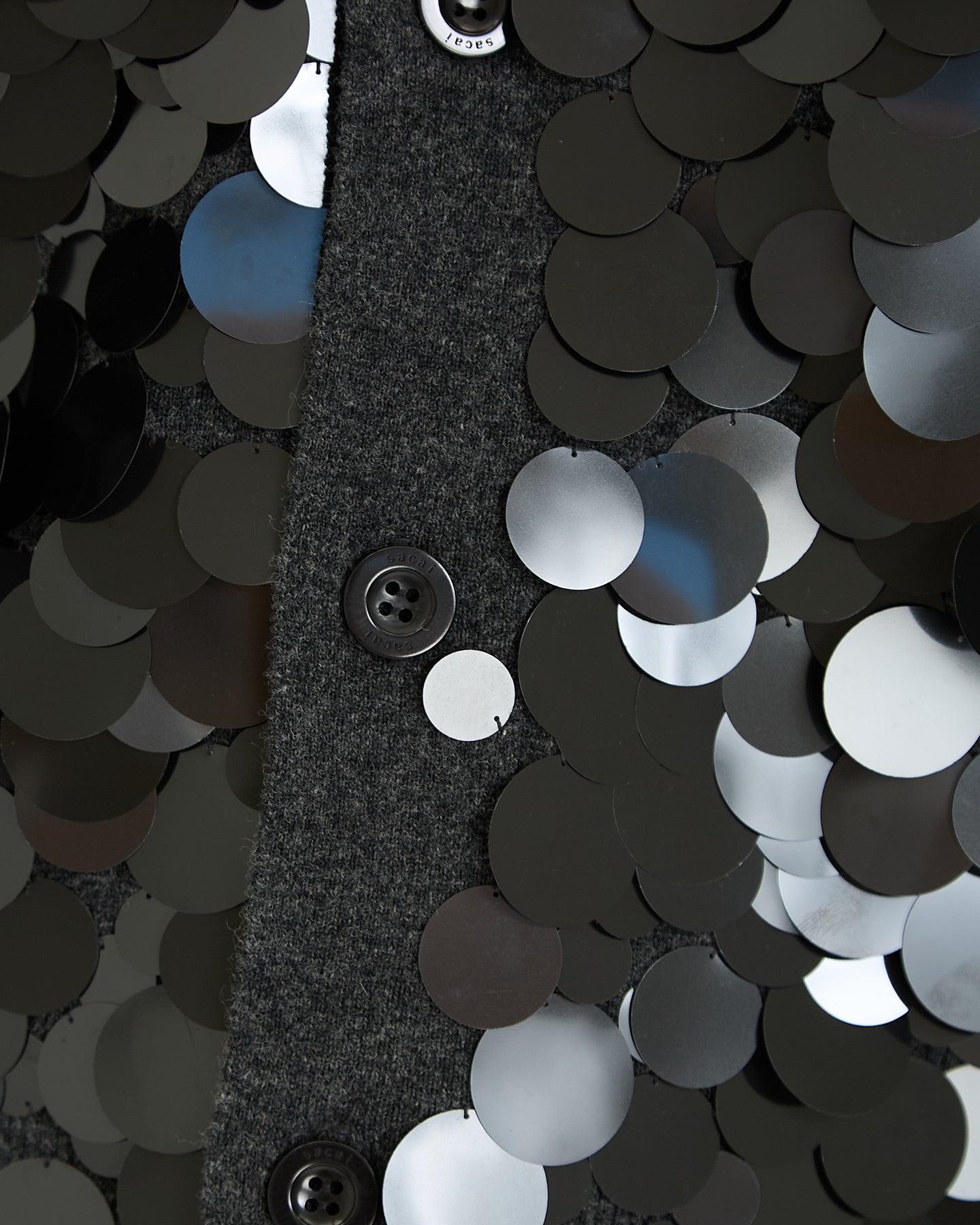 Sacai Sequin Embroidery Cardigan in grey/blk features a classic fit in a wool sequin fabrication. Details include button closures, v-neckline and ribbed finished trims.
