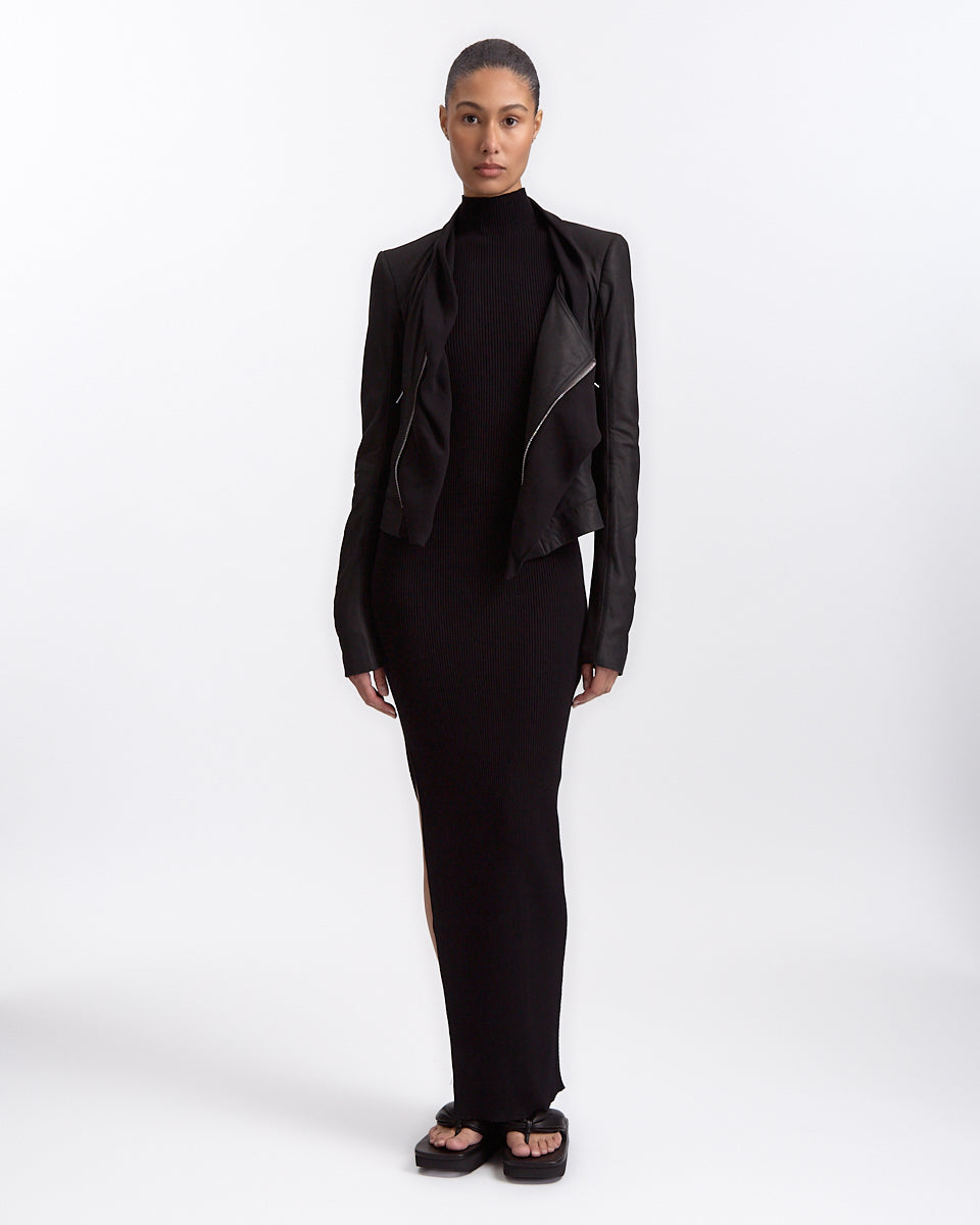 Rick Owens Sleeveless Turtleneck Dress features a floor length dress in a ribbed knit fabrication. Details include no sleeves, turtle neckline and side slit.