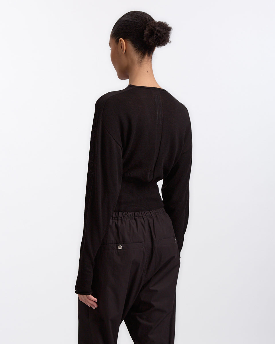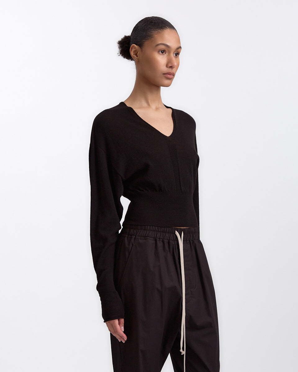 Rick Owens V Cropped Knit in black features a cropped sweater in a wool rasato knit fabrication. Details include v-neckline, drop shoulders, batwing sleeves and wide ribbed waistband.
